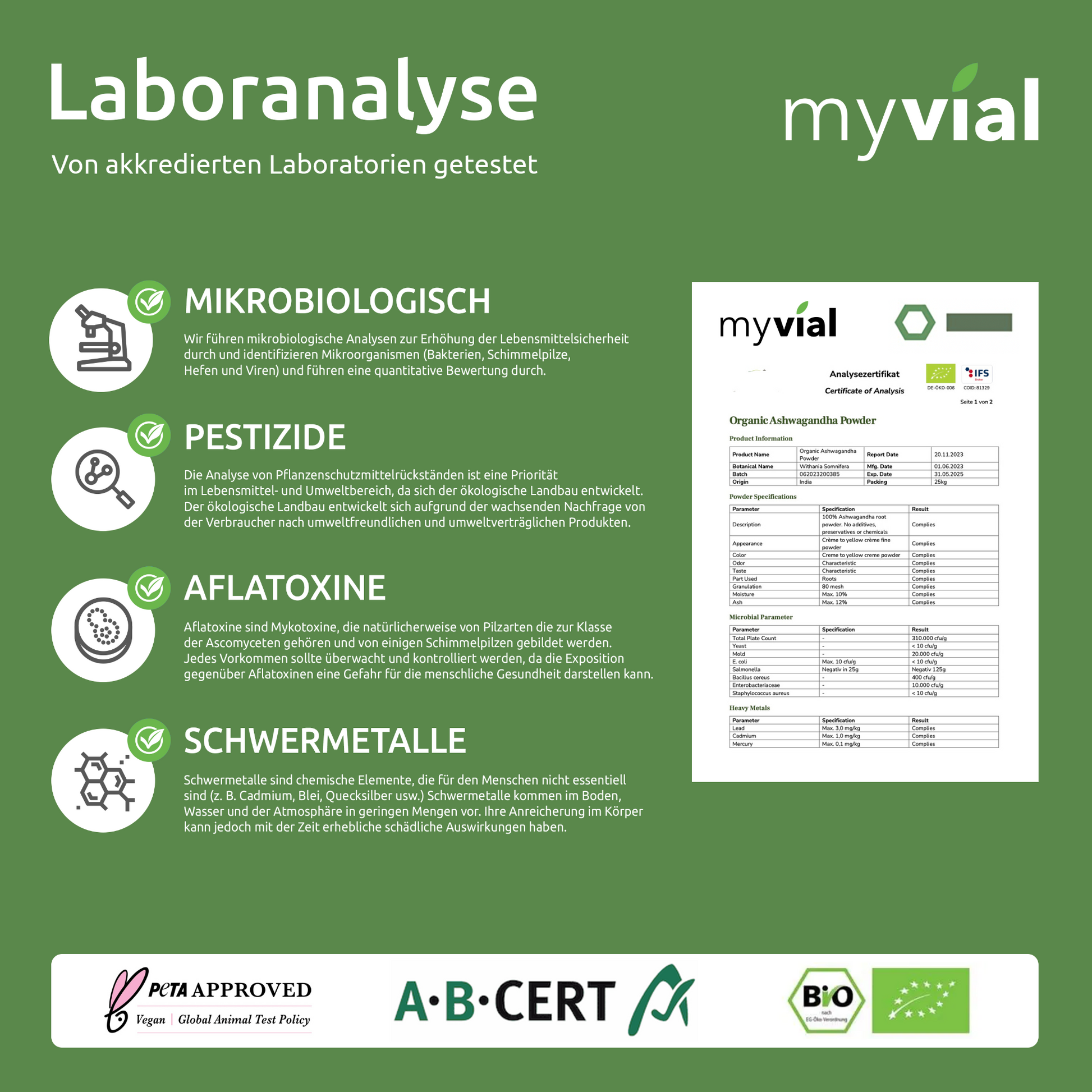 La nostra polvere è ricavata da radici di Ashwagandha (Withania somnifera) di alta qualità, delicatamente essiccate. Il prodotto viene regolarmente testato in laboratorio ed è privo di additivi non necessari, per un'alimentazione consapevole.