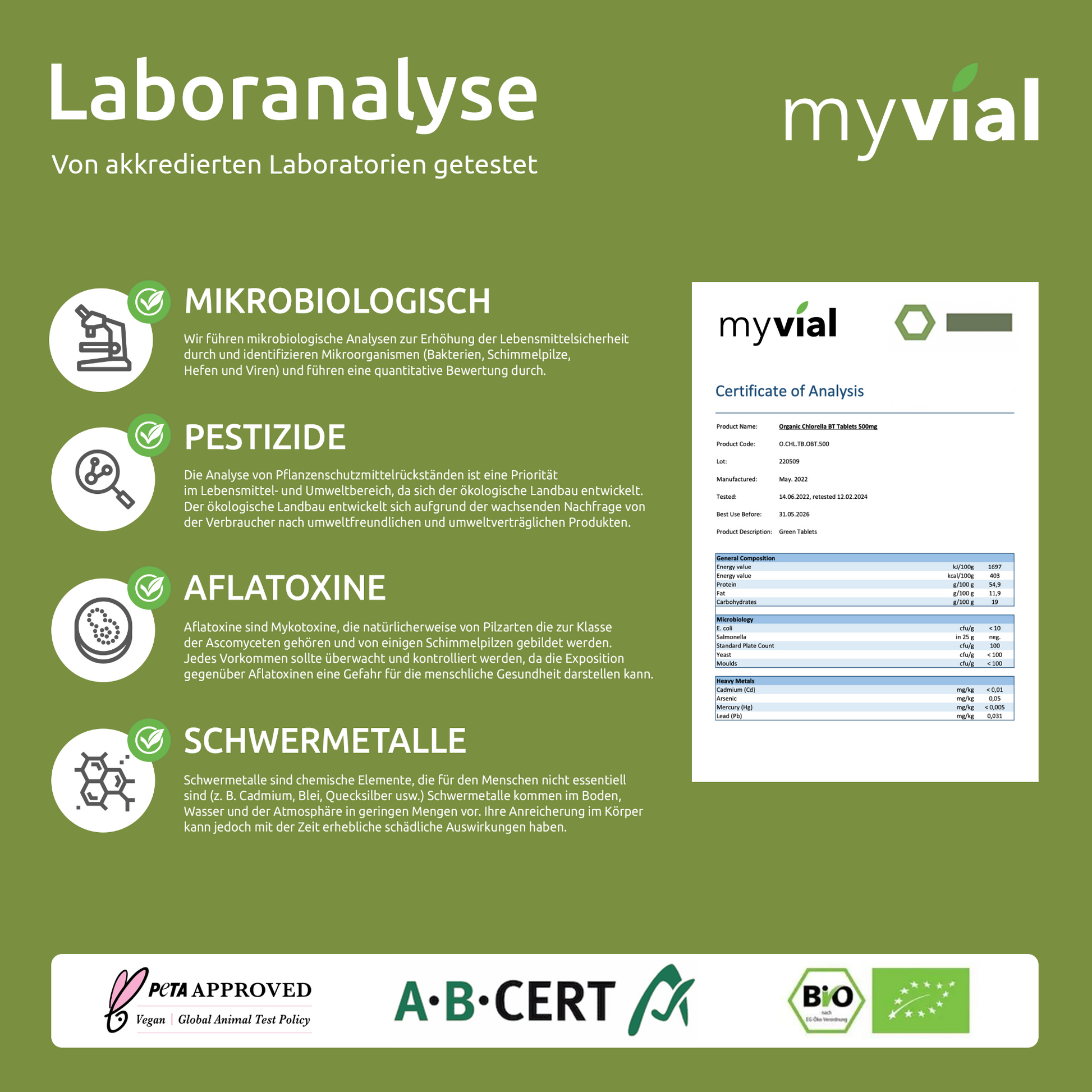 Le nostre compresse di Chlorella biologica vengono confezionate in Germania secondo i più elevati standard e vengono regolarmente testate da laboratori indipendenti.