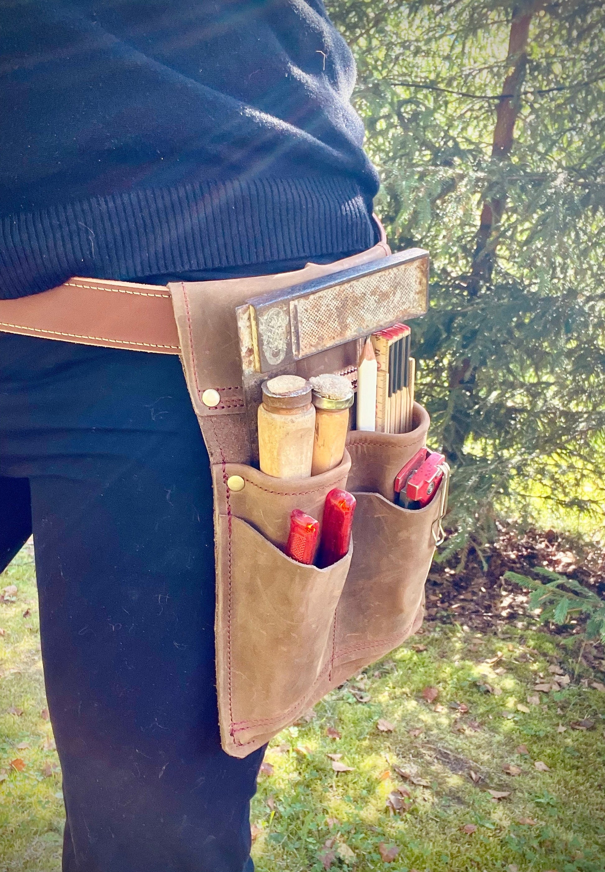 Unsere Allround-Modul 1 – Werkzeugtasche für den Gürtel links, ist die perfekte Ergänzung für jeden Werkzeuggürtel. Hergestellt aus hochwertigem, gewachstem Rindleder, verbindet sie Robustheit, Funktionalität und stilvolles Design.