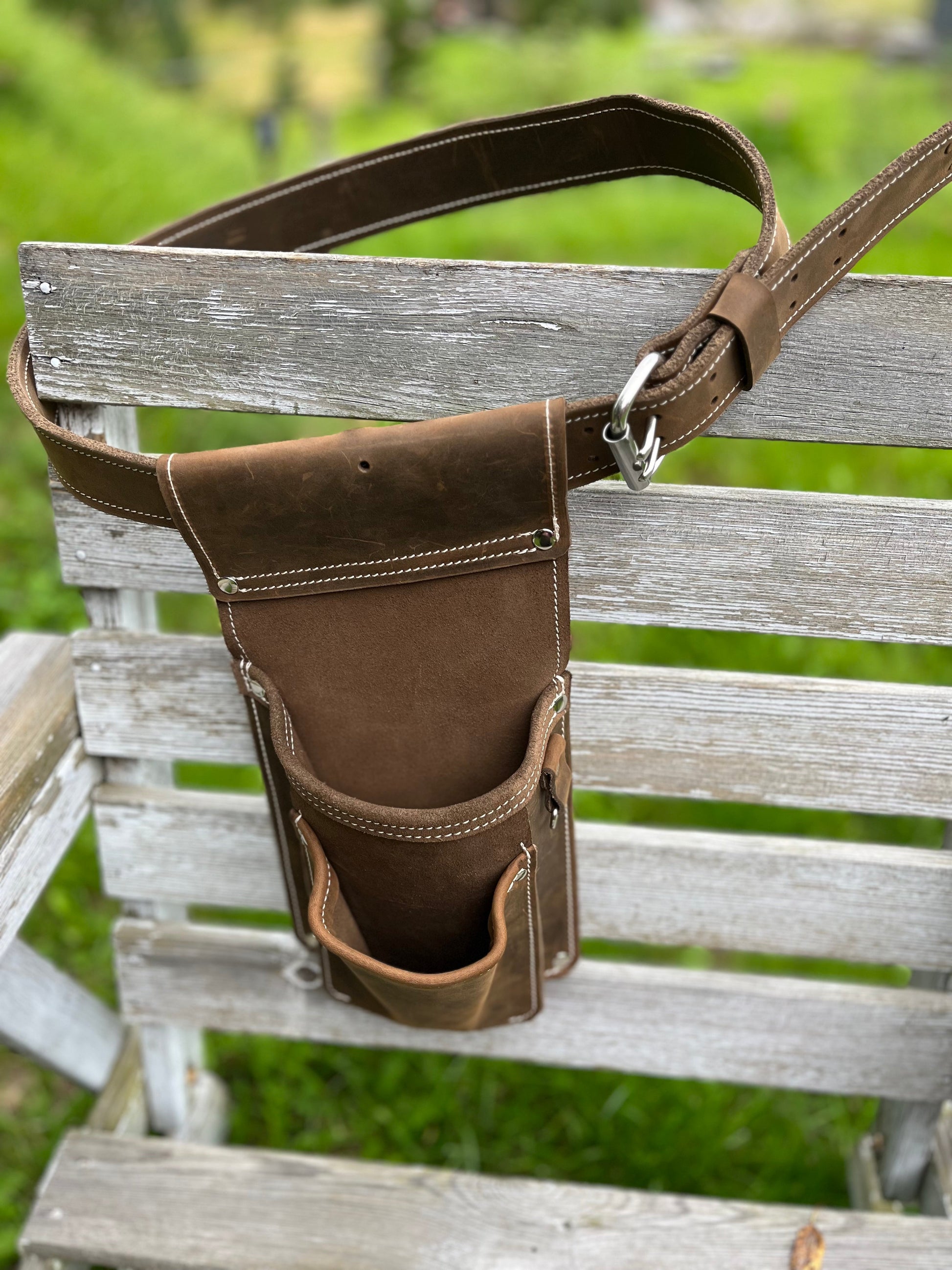 Handgefertigt, doppellagig vernäht und mit einer hochwertigen Edelstahlschnalle versehen, bietet er Stabilität und Langlebigkeit – ob in Werkstatt, Garten oder Alltag.