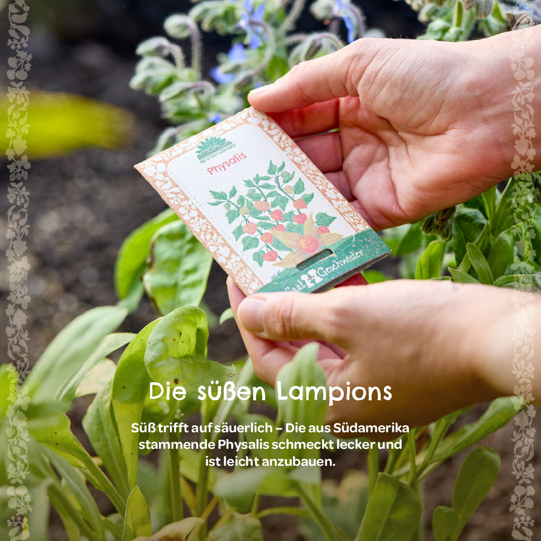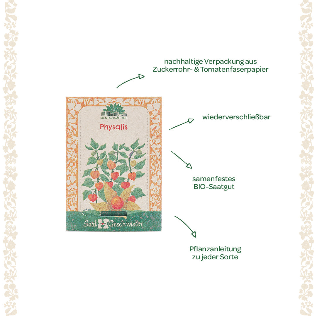 Nachhaltige Verpackung: Das Physalis-Saatgut wird in umweltfreundlichem Zuckerrohrpapier verpackt – eine nachhaltige Alternative. Das liebevolle Design macht das Saatgut zum perfekten Geschenk für einen lieben Menschen.