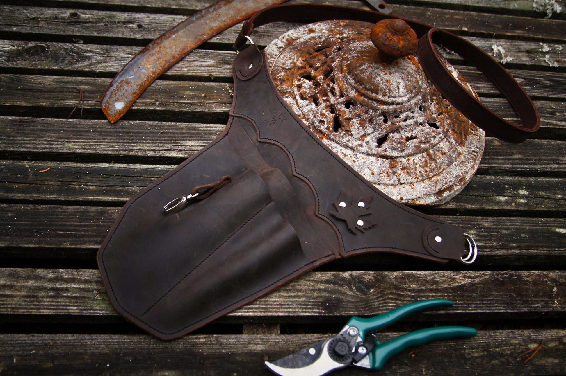 Der Garten Werkzeuggürtel ist aus gewachstem Rindsleder gefertigt. Bei Nutzung entwickelt diese Art Leder eine wunderschöne Patina.