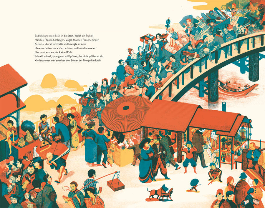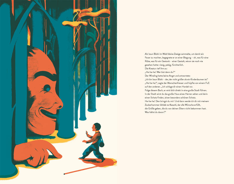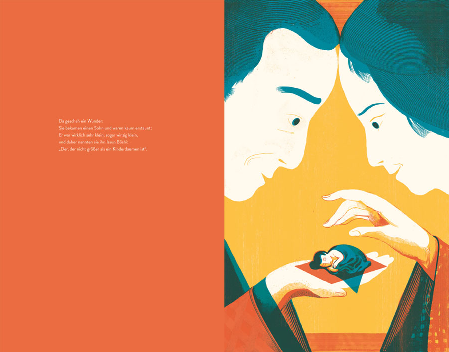 Klein und tapfer – das sind die beiden auffälligsten Merkmale von Issun Bôshi. Seine Mutter hatte sich so sehr ein Kind gewünscht, dass sie unbedarft hinzufügte: „Und wenn es auch ganz klein ist.“ Und tatsächlich wird den betagten Eltern noch ein Sohn geboren: gerade ein Zoll (drei Zentimeter) groß. Fortan wird er Issun Bôshi, der Ein-Zoll-Junge genannt.