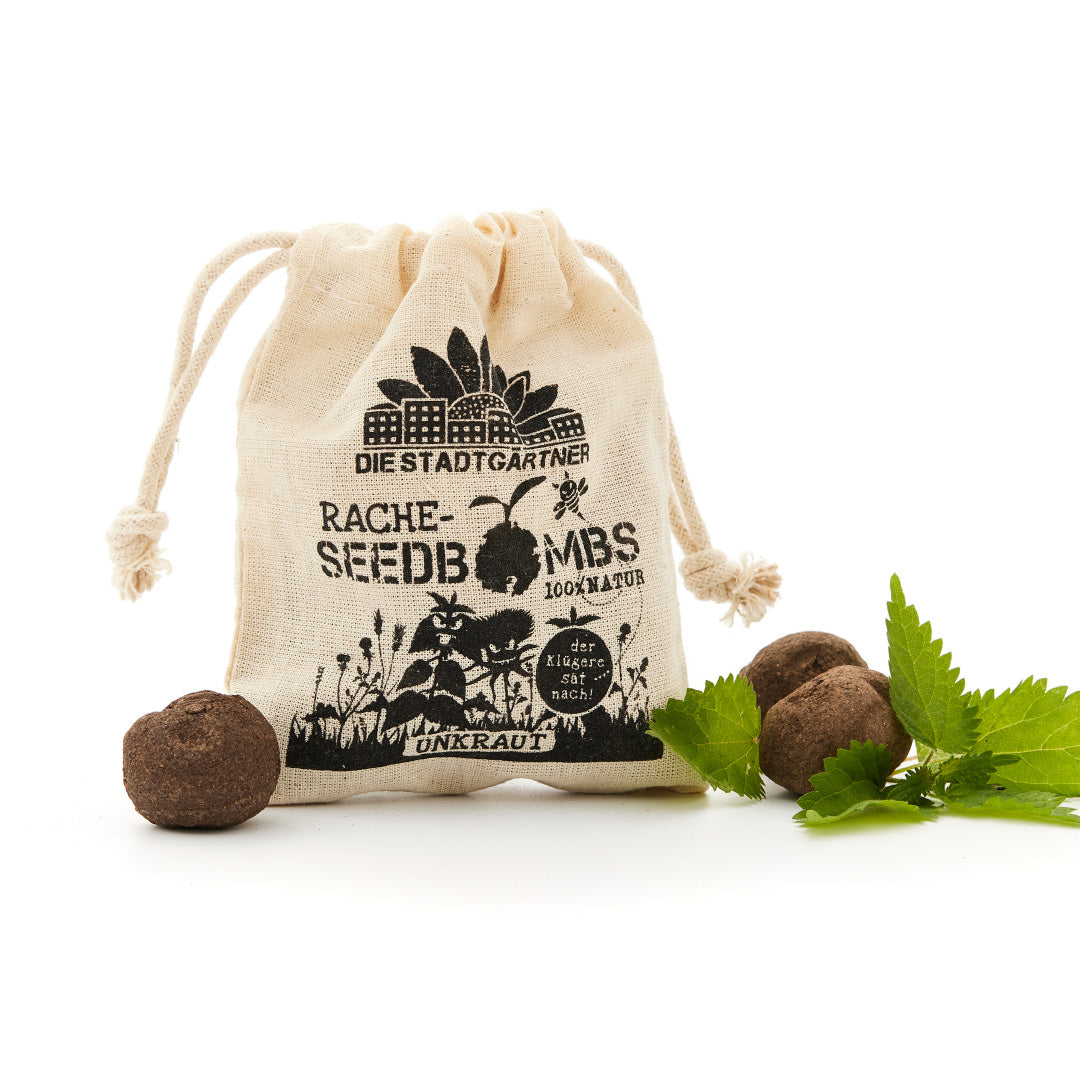 Jede Rachebomb enthält eine Mischung verschiedener Unkräuter, u.a. Brennnessel, Löwenzahn, kriechender Hahnenfuß, Vogelmiere, Rotklee und Disteln. Der Jutebeutel enthält 8 walnussgroße Samenbomben bestehend aus Erde, Ton und Saatgut.