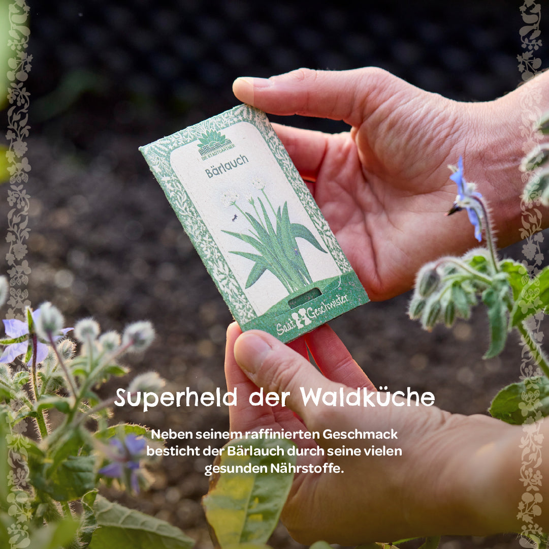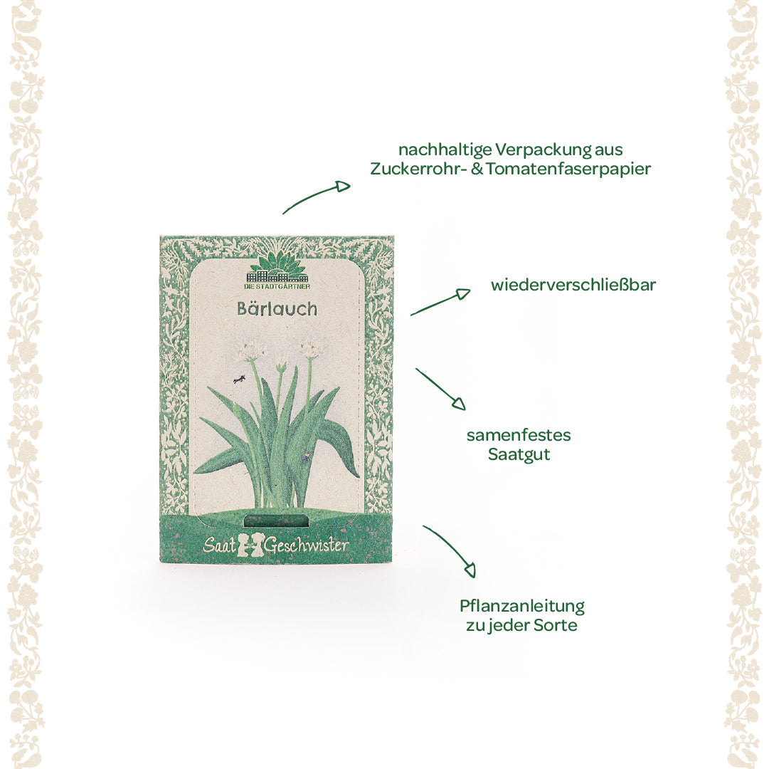 Nachhaltig: Das Bärlauch-Saatgut kommt in einer liebevoll gestalteten Verpackung aus umweltfreundlichem Zuckerrohrpapier. Perfekt für umweltbewusste Gartenliebhaber, die den würzigen Geschmack des „wilden Knoblauchs“ aus eigener Anzucht genießen möchten.