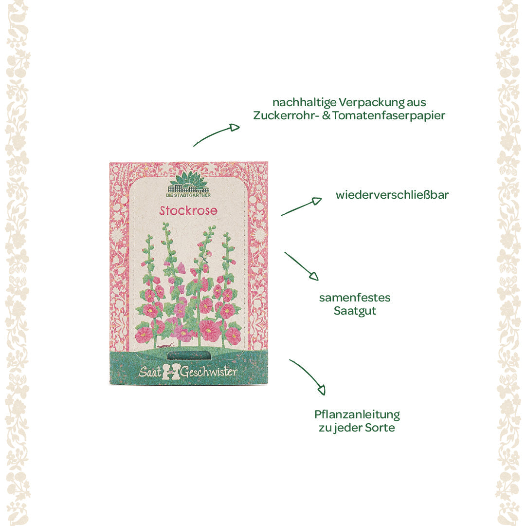 Eine nostalgische Geschenkidee: Das Stockrosen-Saatgut ist eine wundervolle Aufmerksamkeit für Naturliebhaber und Gartenfreunde. Ob zum Geburtstag, als Mitbringsel oder als besonderes Geschenk – die eleganten Blüten sorgen für Freude und Faszination.